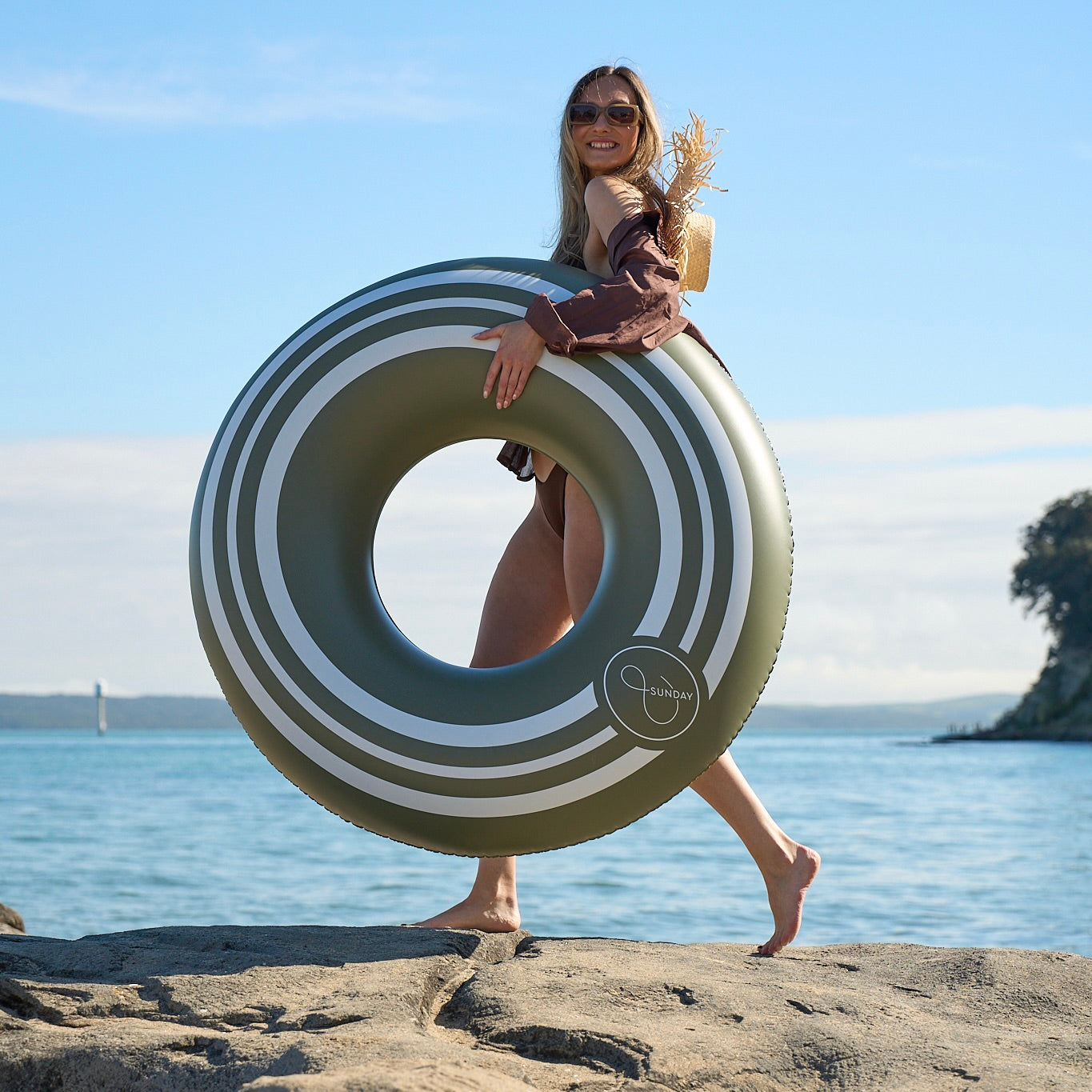 The &SUNDAY sporty oversized pool tube blends retro sports style in this lovely rich olive green, offering a chic yet durable design for your outdoor spaces. Inspired by classic athletic aesthetics, it features bold, stylish stripes.